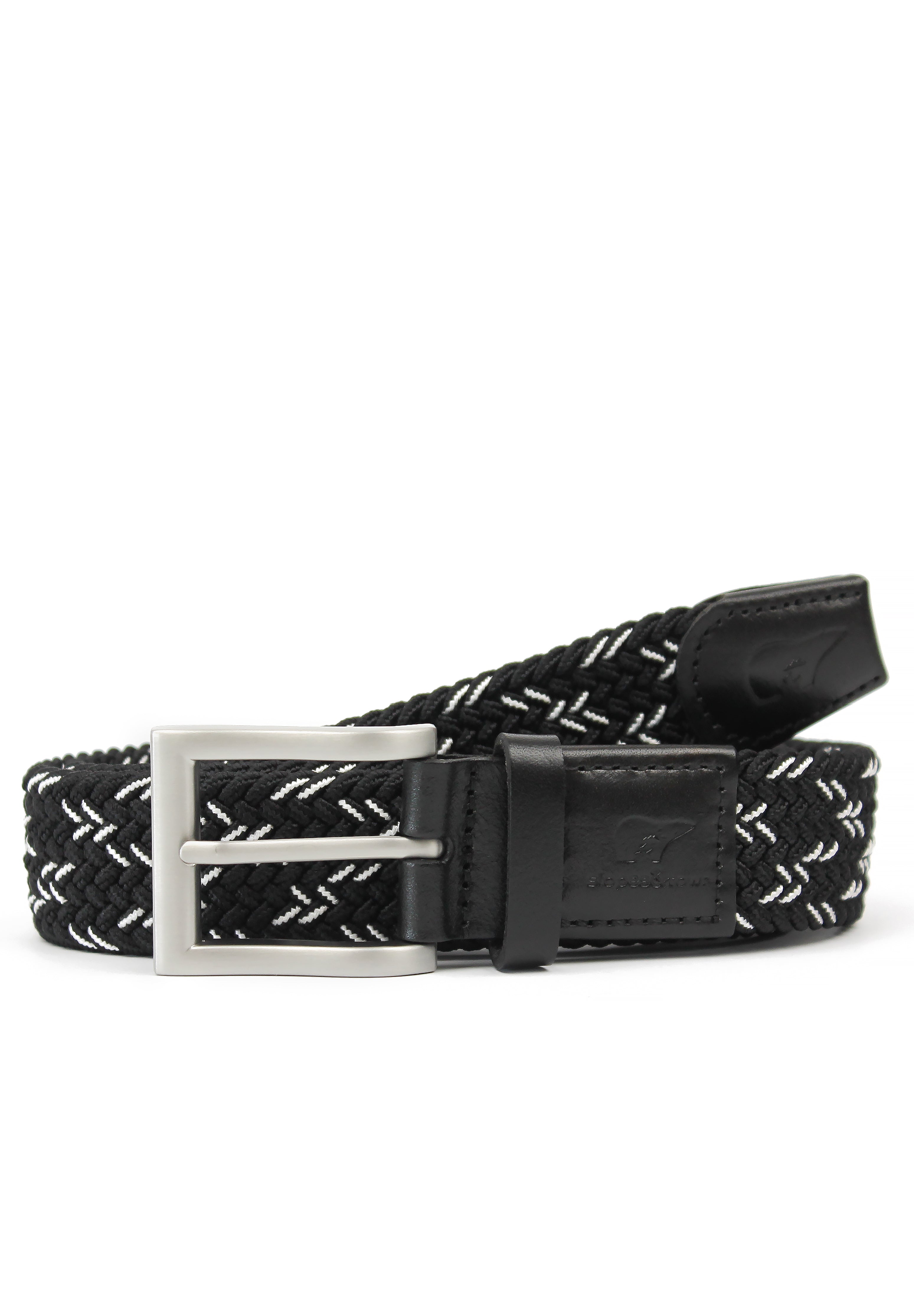 The Black and White Woven Belt, made from recycled plastic, is the perfect addition to any outfit. It is finished using soft, matte brown leather, featuring the Slopes&Town logo, and a sleek chrome buckle. These belts offer effortless wear, a gentle feel, and versatility to fit various sizes.
