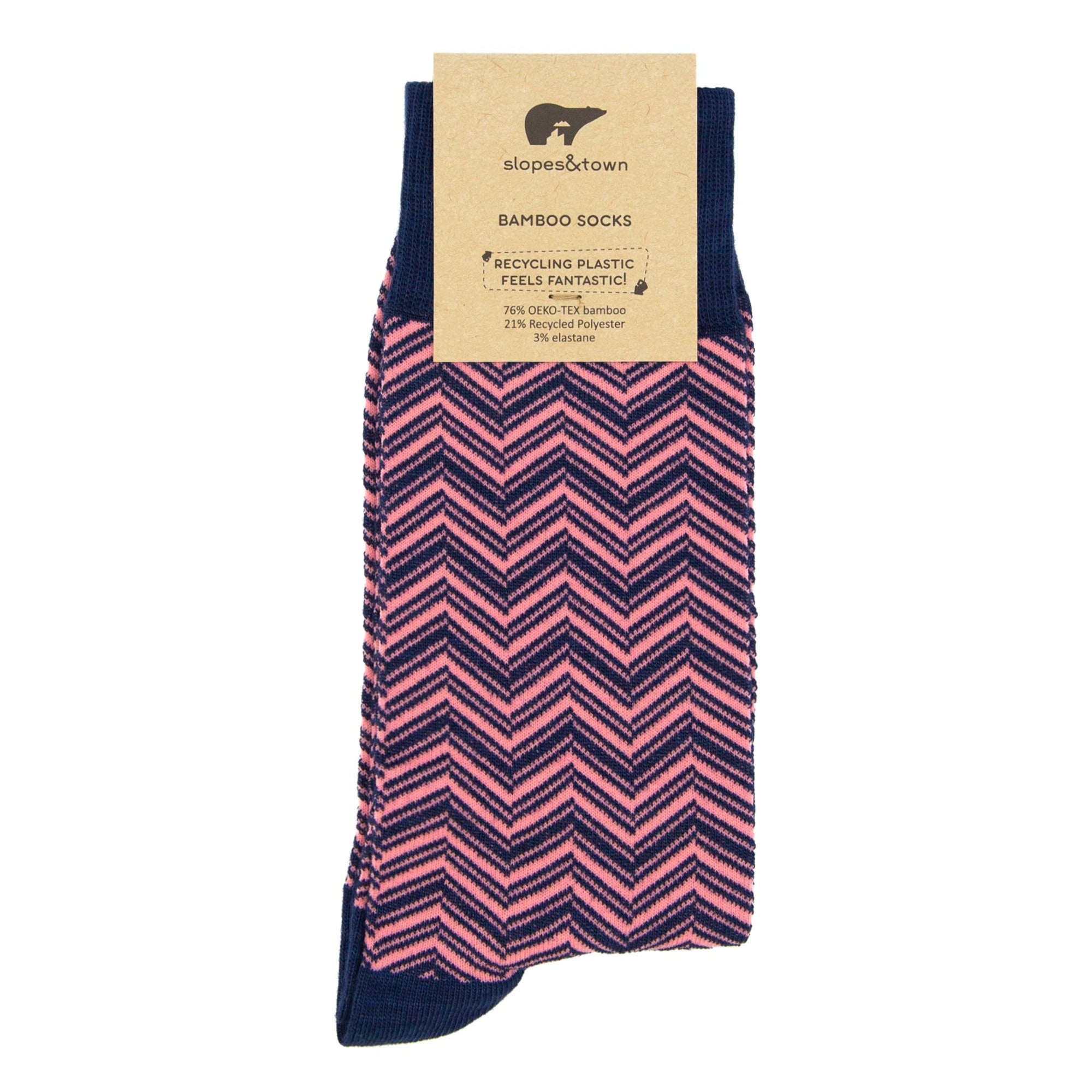 Experience the perfect blend of comfort and sustainability with Slopes&Town Blue and Salmon Herringbone bamboo socks.