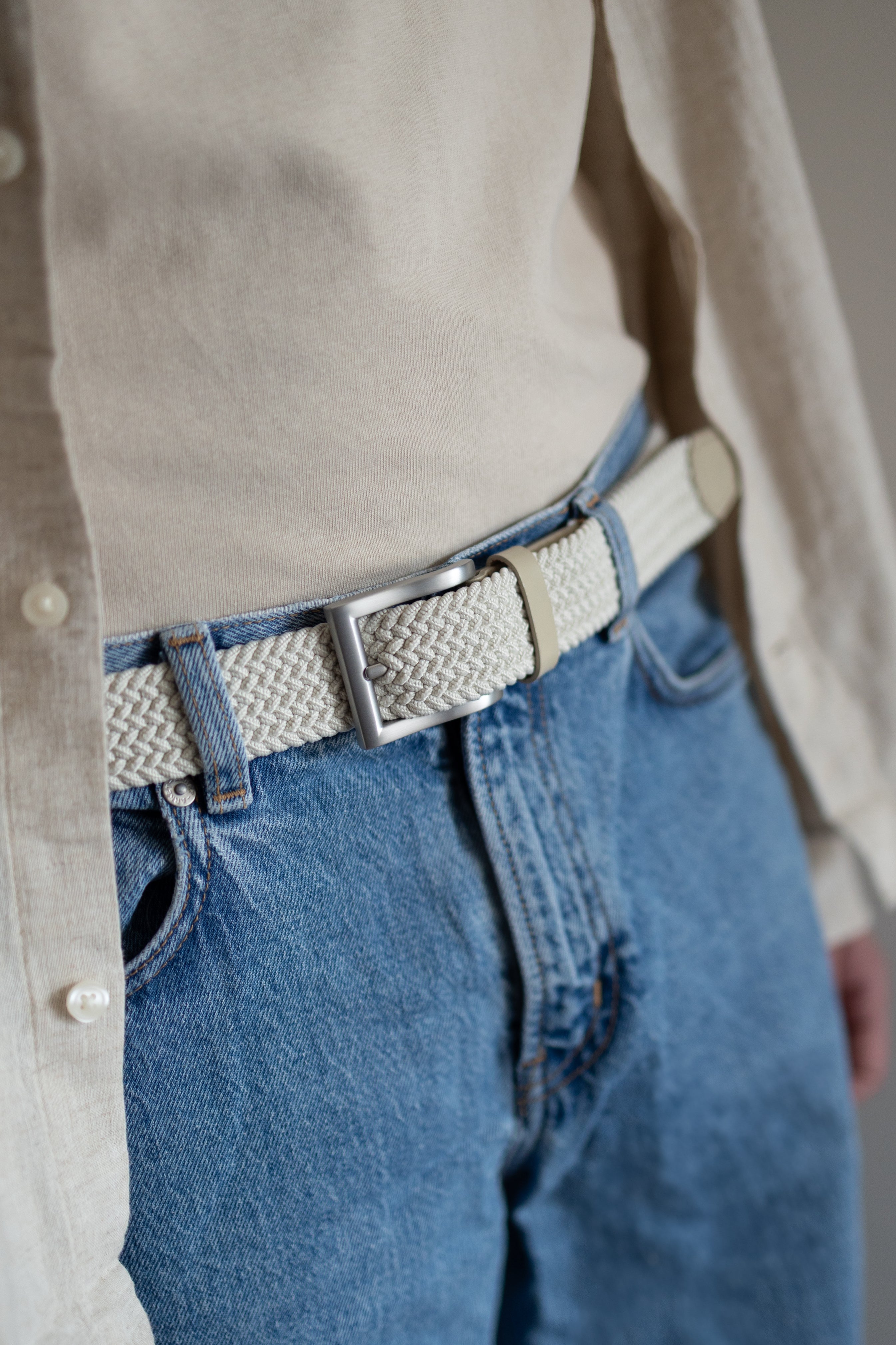 We hebben de traditionele geweven riem opnieuw uitgevonden door deze te vervaardigen van gerecycled PET-garen, waarmee we onze inzet tegen plasticvervuiling verder versterken. PET-plastic is een van de meest gebruikte plastics ter wereld en komt vaak voor in wegwerpflessen voor dranken, waardoor dagelijks miljoenen flessen worden weggegooid.