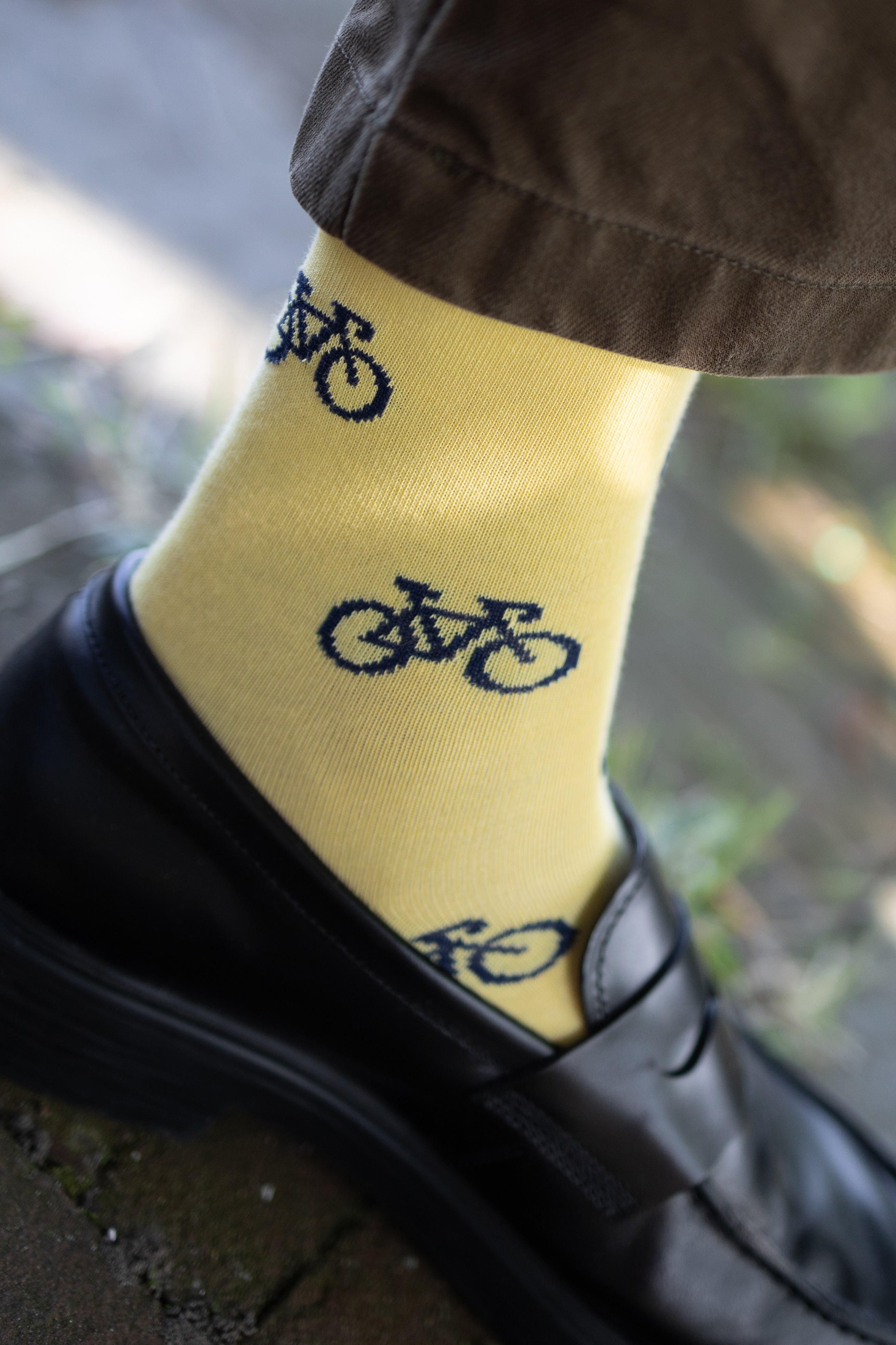 Ervaar de perfecte mix van comfort en duurzaamheid met Slopes&Town Yellow en Dark Blue Bicycles bamboesokken.